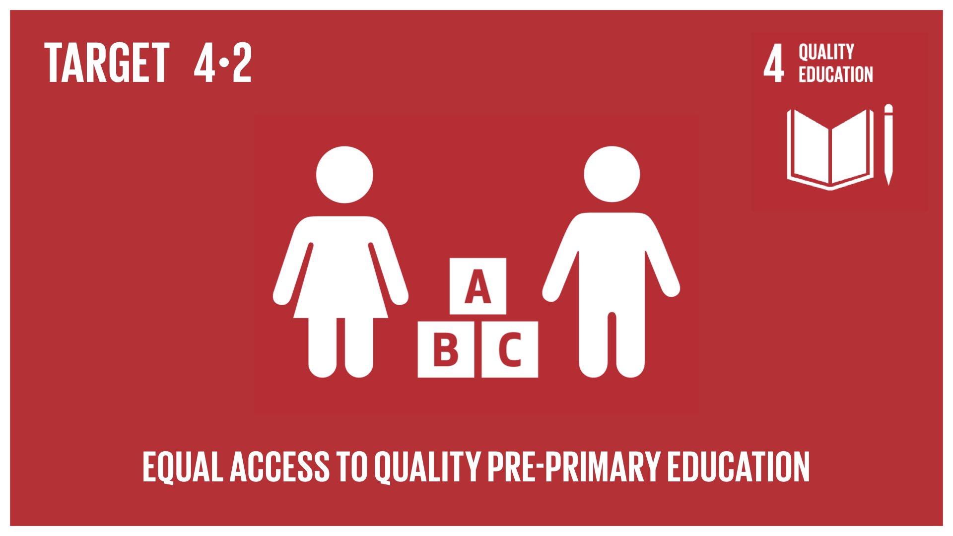 4.2 Er tegen 2030 voor zorgen dat alle meisjes en jongens in hun vroege kindertijd toegang hebben tot een kwalitatieve ontwikkeling, zorg en opvoeding voorafgaand aan de lagere school zodat ze klaar zijn voor het basisonderwijs.