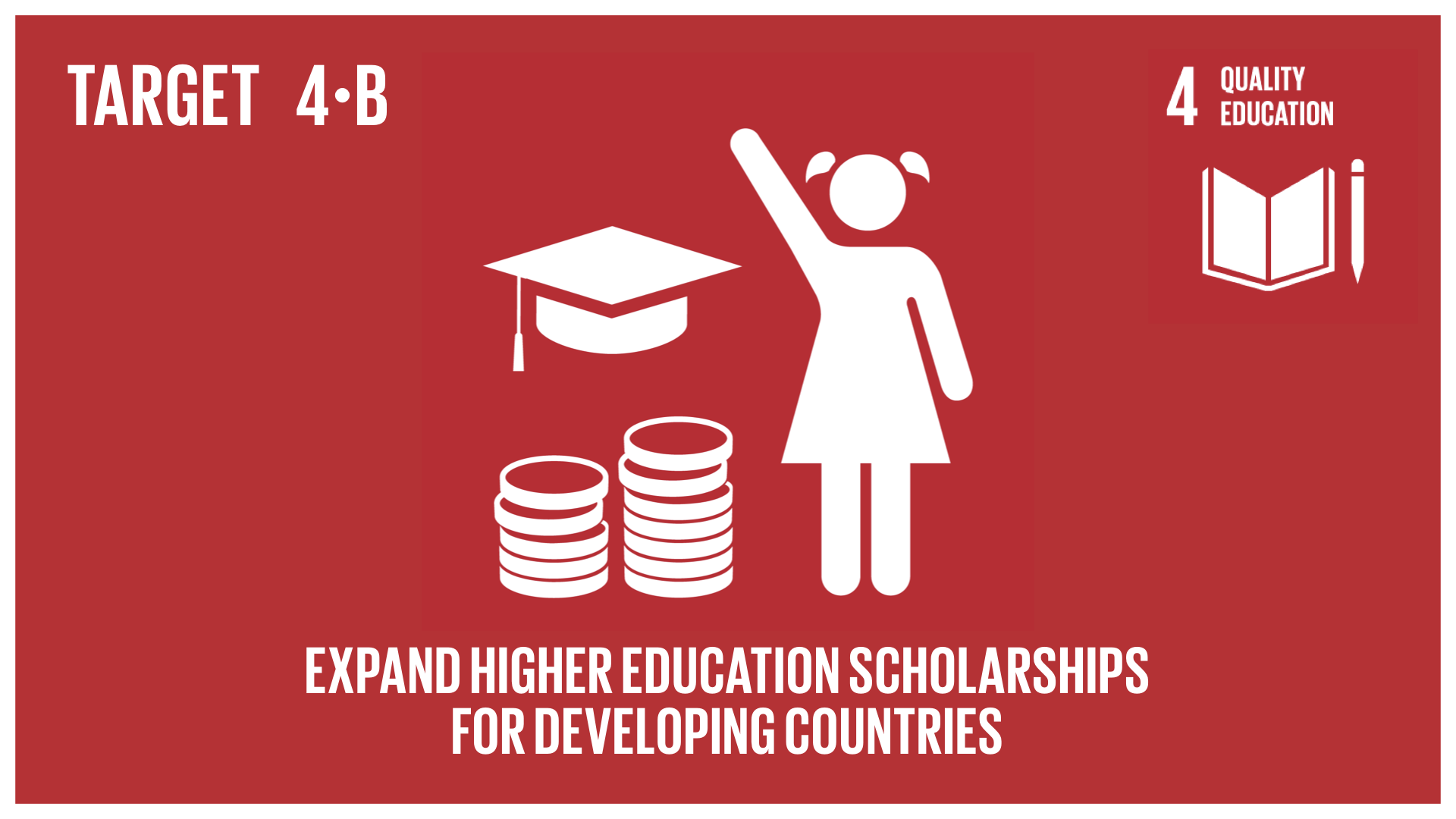 4.b Tegen 2020 het aantal studiebeurzen wereldwijd en substantieel verhogen dat beschikbaar is voor ontwikkelingslanden, in het bijzonder de minst ontwikkelde landen, de kleine eilandstaten en de Afrikaanse landen, voor toegang tot het hoger onderwijs, met inbegrip van beroepsopleiding en programma’s omtrent informatie en communicatietechnologie, techniek, ingenieurswezen en wetenschappen, in ontwikkelde landen en andere ontwikkelingslanden.