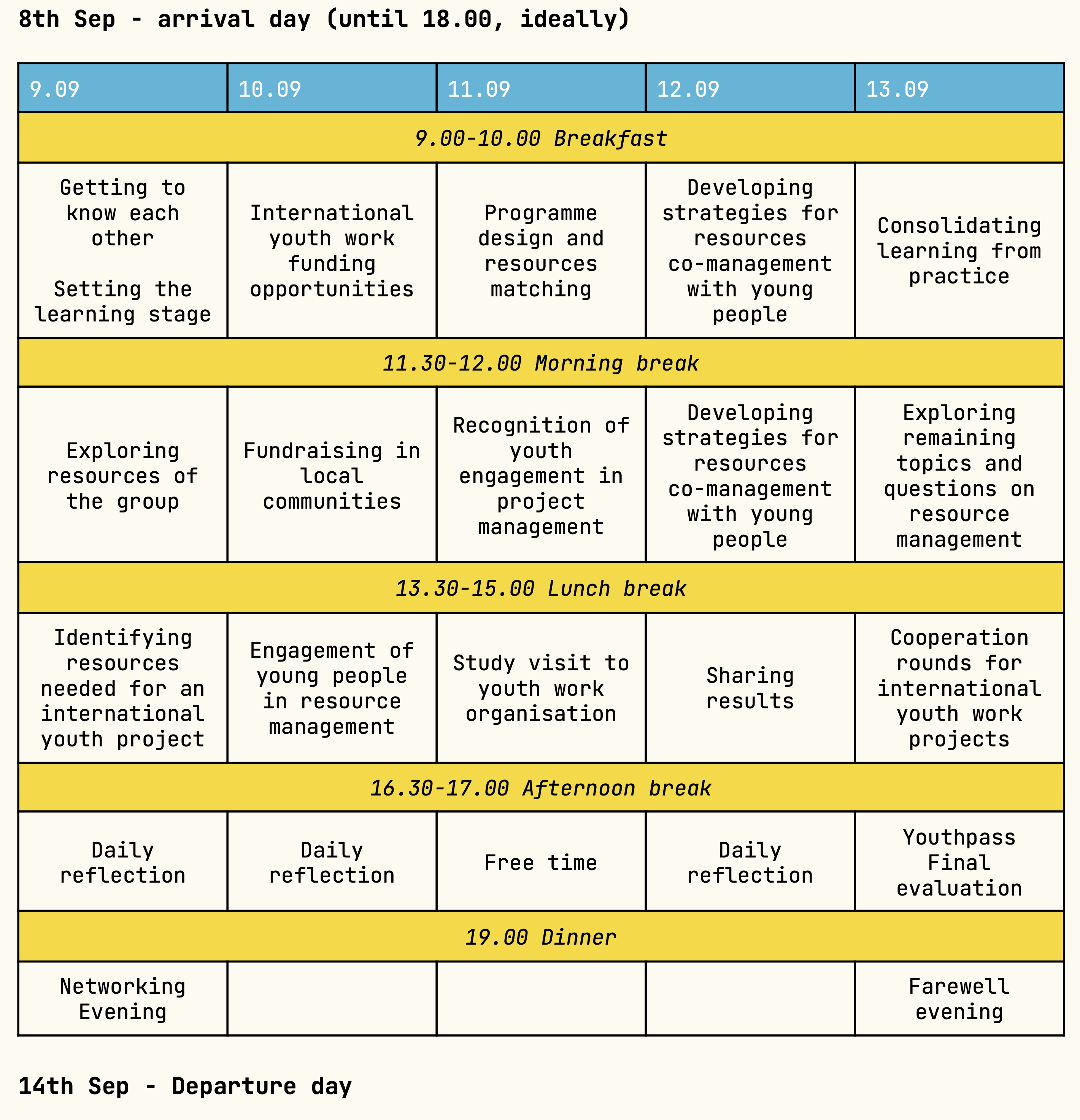 • Long-term development opportunity - participants willing to continue developing their professional youth work competences will be invited to apply for upcoming training courses in other competence areas.