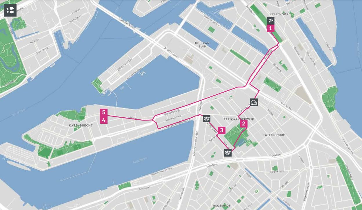 De houder van deze badge heeft de Katendrecht wandelroute in Rotterdam Zuid gewandeld, waarbij de volgende activiteiten en initiatieven zijn bezocht: