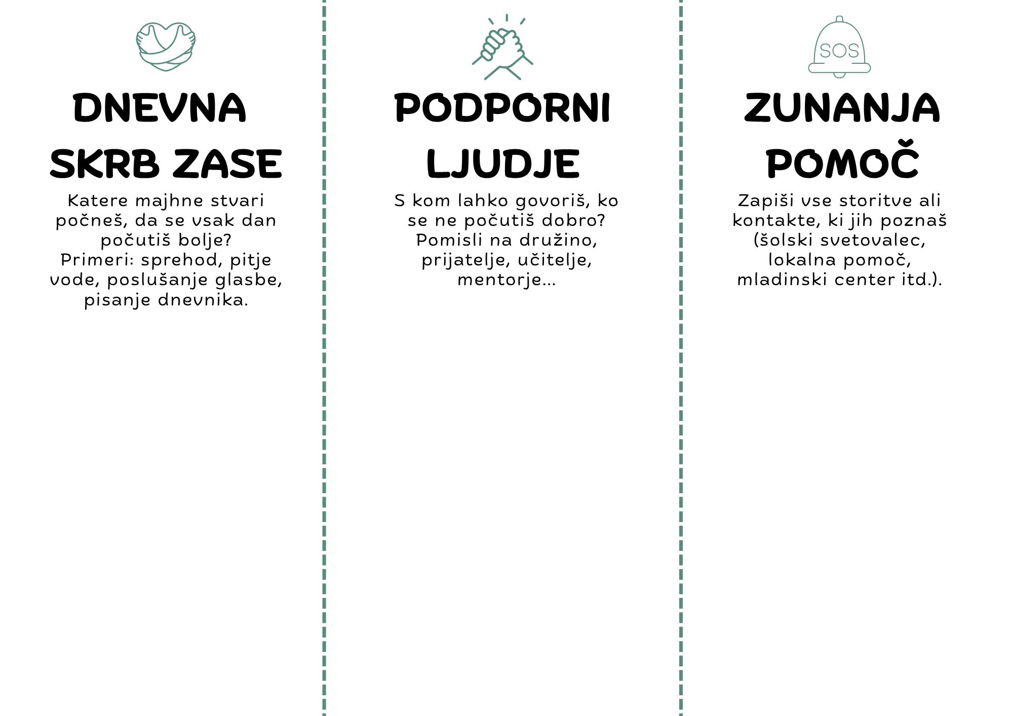 Vzemimo si nekaj minut in si ustvarimo osebno zbirko orodij za dobro počutje. To ti bo pomagalo razumeti, kaj podpira tvoje dobro počutje, in kam se lahko obrneš, če potrebuješ pomoč. Razdeli si papir na tri dele in odgovori v vsak del posebej: